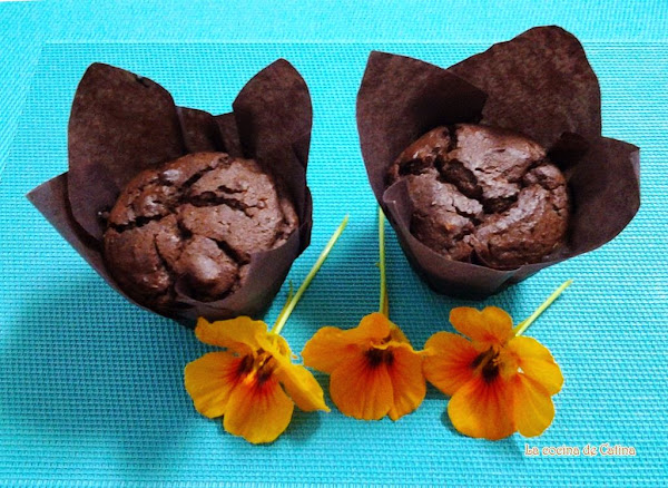 En otro cuenco batir los huevos con la vainilla, hasta que estén espumosos. Añadirlos a la mezcla anterior removiendo continuamente, incorporamos la leche poco a poco sin dejar de batir y a continuación añadir la harina tamizada con la levadura. Mezclamos y añadimos el chocolate (que lo habremos derretido al baño maría o en el microondas) y las nueces cortadas en trocitos. Mezclamos bien y vertemos la mezcla en las capsulas de papel que tenemos preparadas llenado hasta 2/3 de su altura.