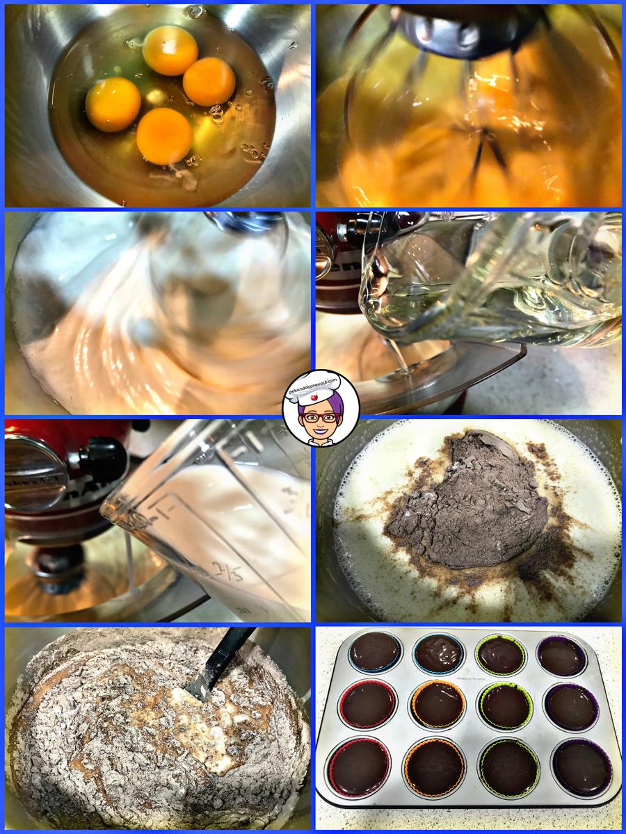 Llenamos las cápsulas y las dejamos en la nevera durante una hora cuando se vaya aproximando el momento se sacarlas de la nevera ponemos a precalentar el horno a 180º, horneamos durante 10-15 minutos depende de cada horno o hasta que pinchándolas con un palillo salga limpio.