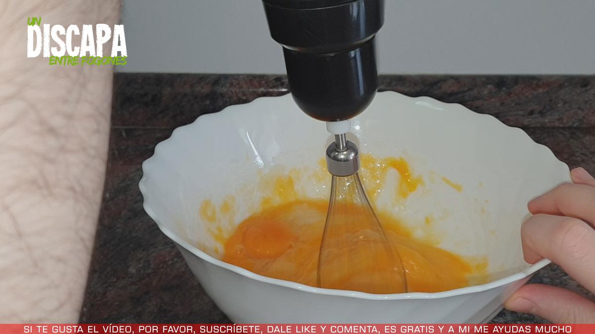 2En un bol añadimos 4 huevos, añadimos tambien el azúcar y batimos hasta que la mezcla empiece a espumar.