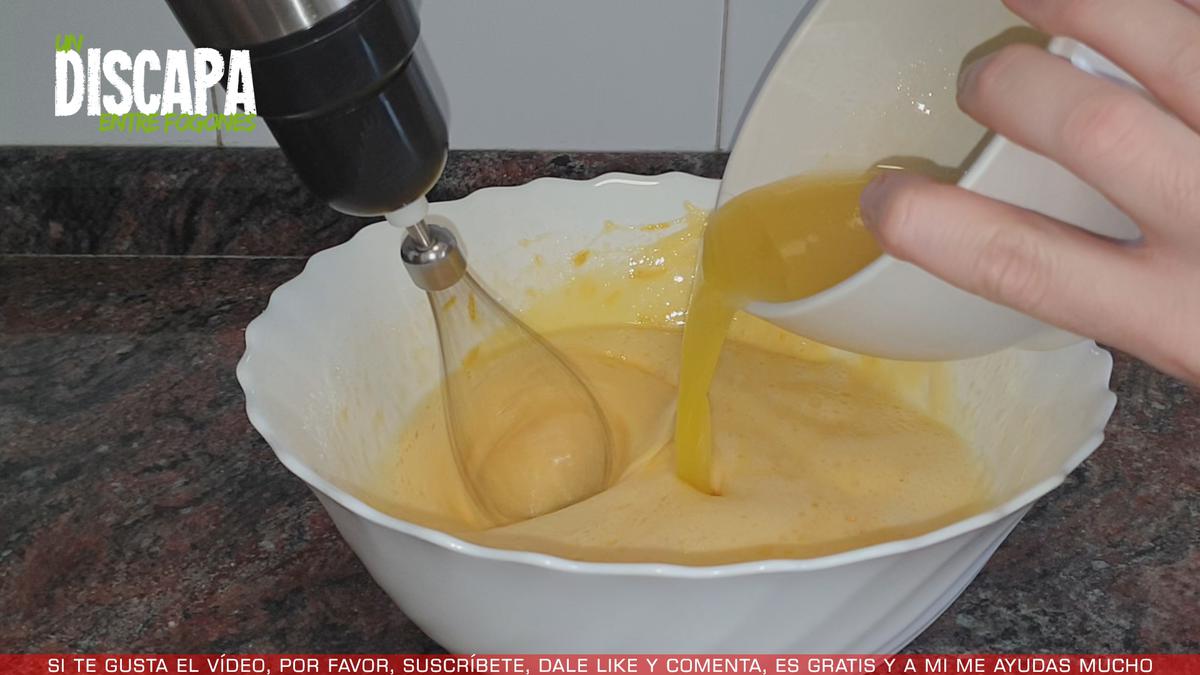 4Ahora mientras seguimos batiendo añadimos la mantequilla derretida, la leche y el aceite y seguimos batiendo hasta integrar los ingredientes.