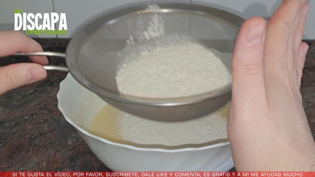 6Ahora, con la ayuda de un colador, vamos incorporando la harina a la mezcla de los huevos, así nos aseguramos que no se formen grumos. Mezclamos todo bien con cuidado de que la harina no salga volando.