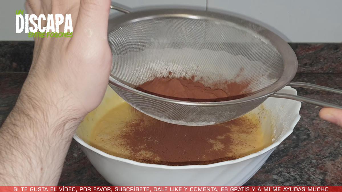 7Ahora incorporamos el cacao en polvo. Lo tamizamos con la ayuda de un colador y mezclamos bien.