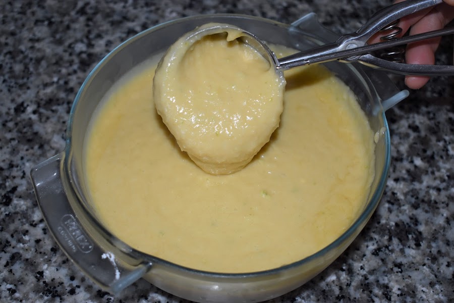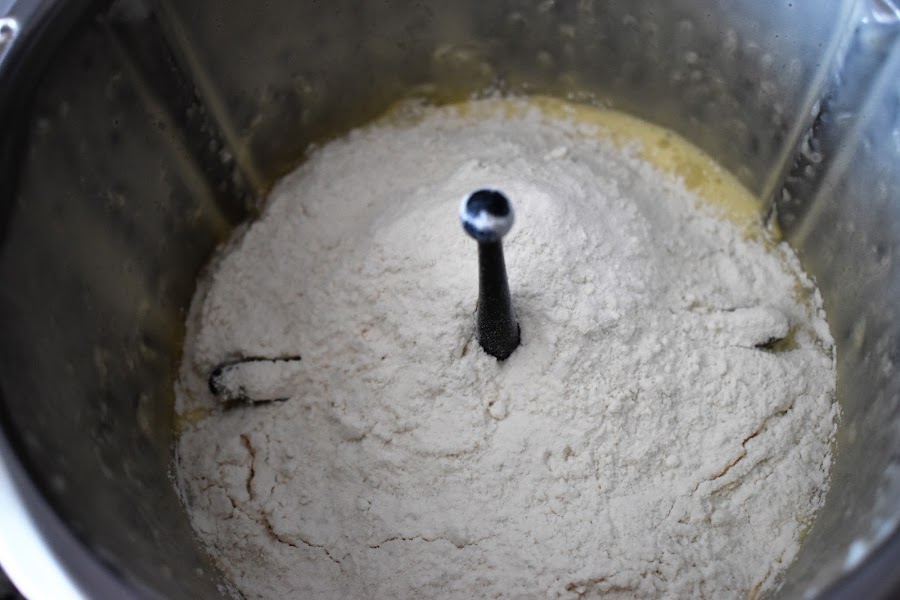 Ahora añadimos la harina con la piel de lima que teníamos reservada y mezclamos 30 seg./ vel. 3, si queda algún resto de harina sin mezclar lo removemos con una lengua de silicona.