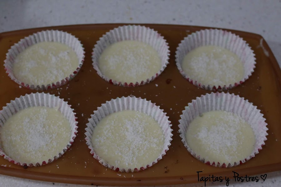 Ponemos la masa en cápsulas de papel y estas en un molde de silicona o de metal. Espolvoreamos azúcar y coco. Al horno.
