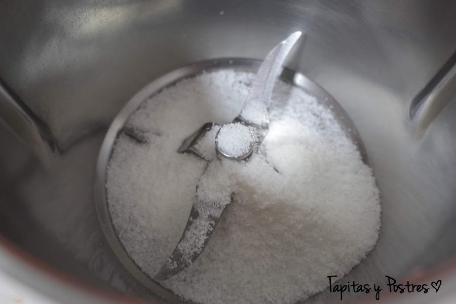 Primero vamos a triturar el azúcar con el coco rallado 10 segundos a velocidad 10.