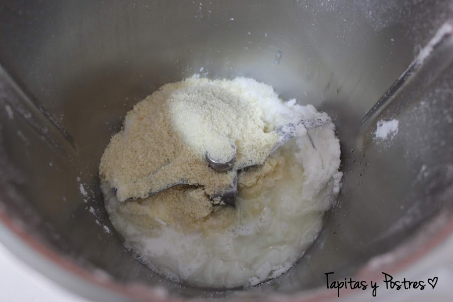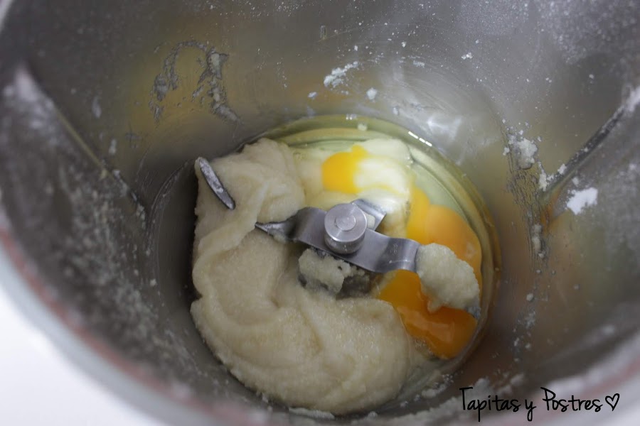 A continuación añadimos la almendra molida y mezclamos bien 20 segundos a velocidad 4. Después integramos el aceite y el huevo y volvemos a batir.Por último se añade la maicena y la levadura,mezclamos bien 20 segundos a velocidad 4.