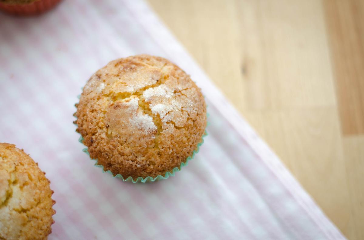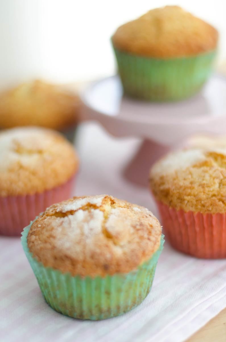 6.- Mientras precalentamos el horno a 190ºC, rellenamos los moldes de las magdalenas en sus tres cuartas partes. Espolvoreamos cada magdalena con una pizca de azúcar y horneamos durante 20-25 minutos.