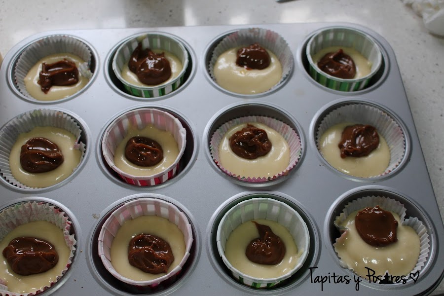 Ponemos en las cápsulas una cucharada de masa y en medio un poquito de dulce de leche