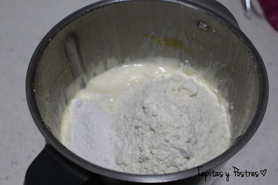 Quitamos la mariposa y añadimos la leche, el aceite, la sal, la harina y la levadura. Mezclamos 30 segundos a velocidad 5.
