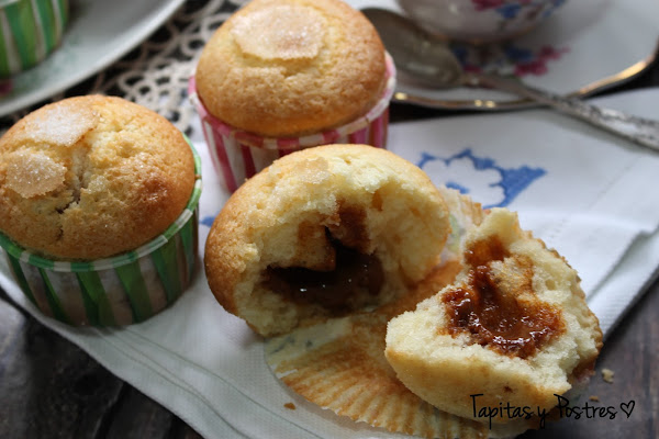 Que ricas me han quedado estas magdalenas. Pensaba hacerlas sin nada, al estilo tradicional, pero después me di cuenta de que tenia un bote de dulce de leche a medio acabar y se me ocurrió ponerle un poquito de relleno.