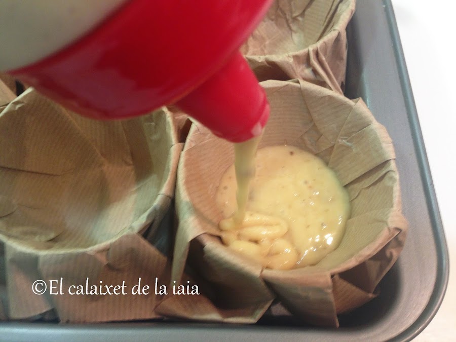 e iremos rellenando nuestras cápsulas hasta la tercera parte de su capacidad, utilizo para éste tipo de magdalena, que llamamos "valenciana", cápsulas más grandes de las normales, y las hago en casa con papel de estraza, pinchando en el enlace veréis que fácil es hacerlas http://calaixetdelaiaia.blogspot.com.es/2016/07/como-hacer-capsulas-para-magdalenas.html