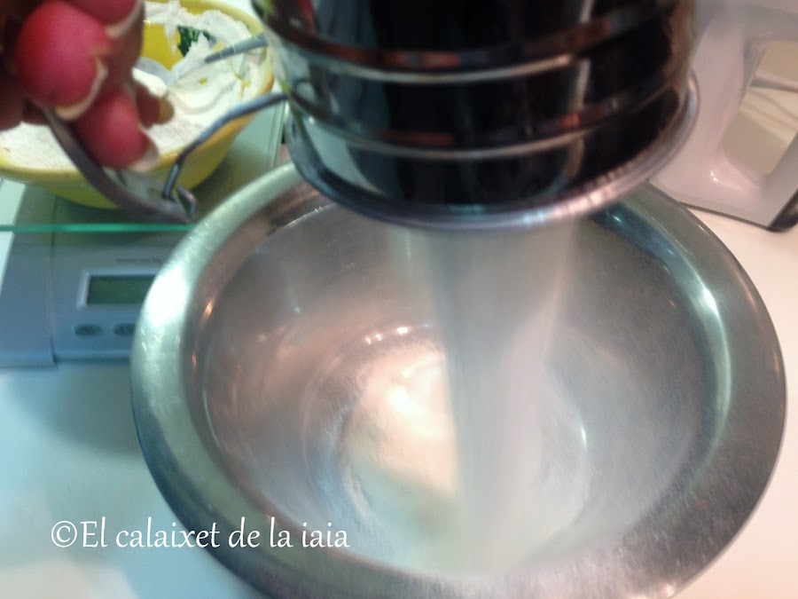 ahora vamos con los sólidos, para ello, haremos la misma operación de entibiado del bol o cuenco, secaremos bien y tamizaremos la harina, si no tenéis tamizador, lo podéis hacer con un colador e ir golpeando con el dorso de la mano. Aseguraros de no tener mucha corriente de aire, yo si la tenía en ése momento, todo abierto por el calor, y hemos terminado la bancada, la vitro y yo....llenas de harinaaaa