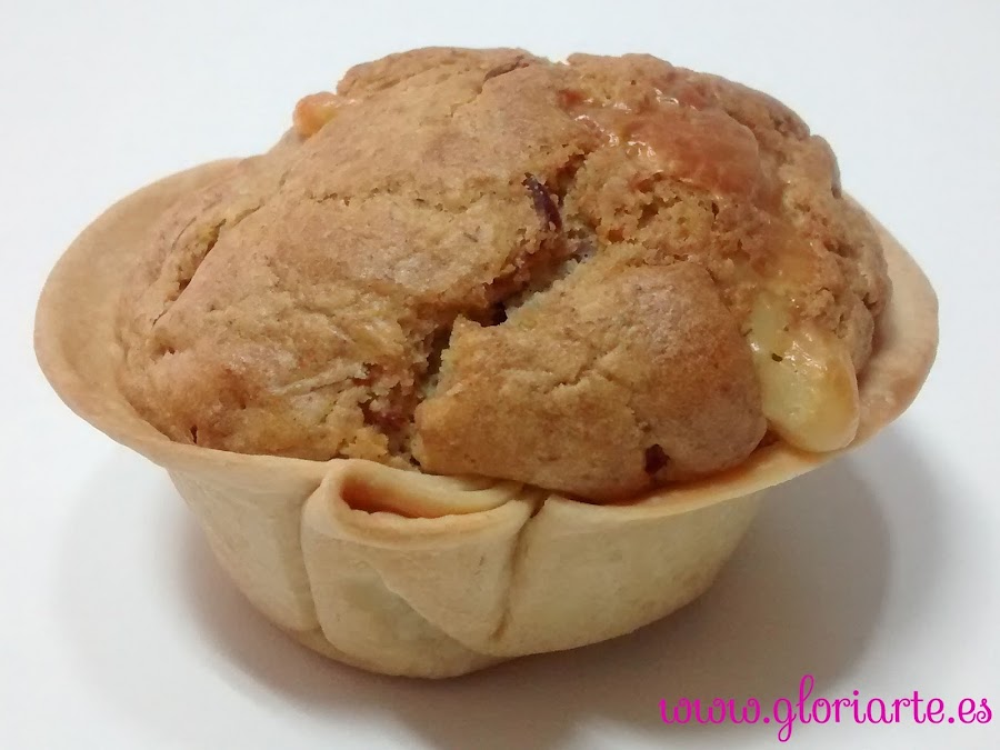 En un molde para magdalenas colocamos las obleas para empanadillas, a modo de cuenquito, en cada compartimento y a continuación rellenamos con la mezcla.