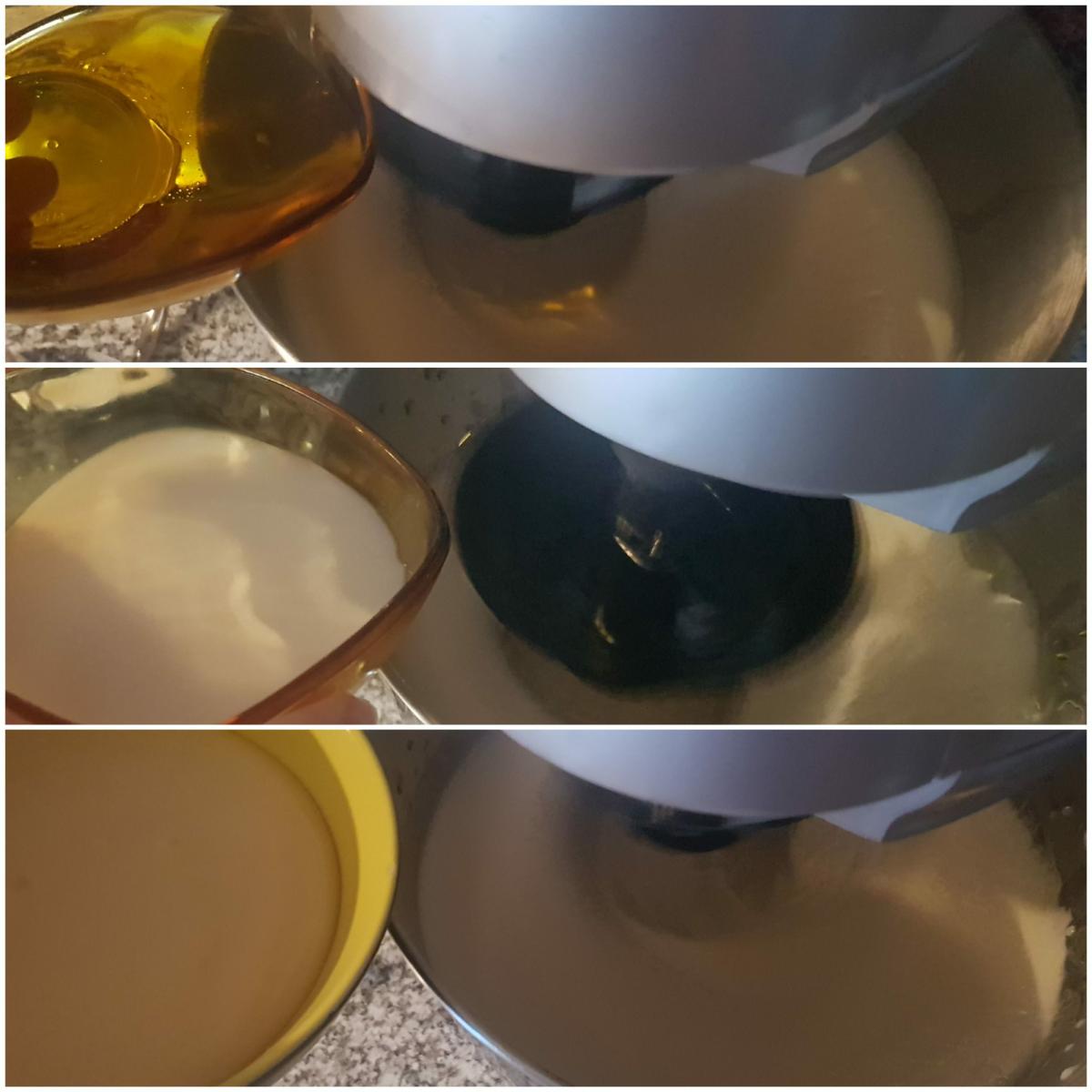 Seguimos con los ingredientes Una vez los huevos hayan duplicado su volumen, bajamos la velocidad de la batidora y agregamos, el aceite, el azúcar y como último la leche condensada, y lo dejamos batir un par de minutos.