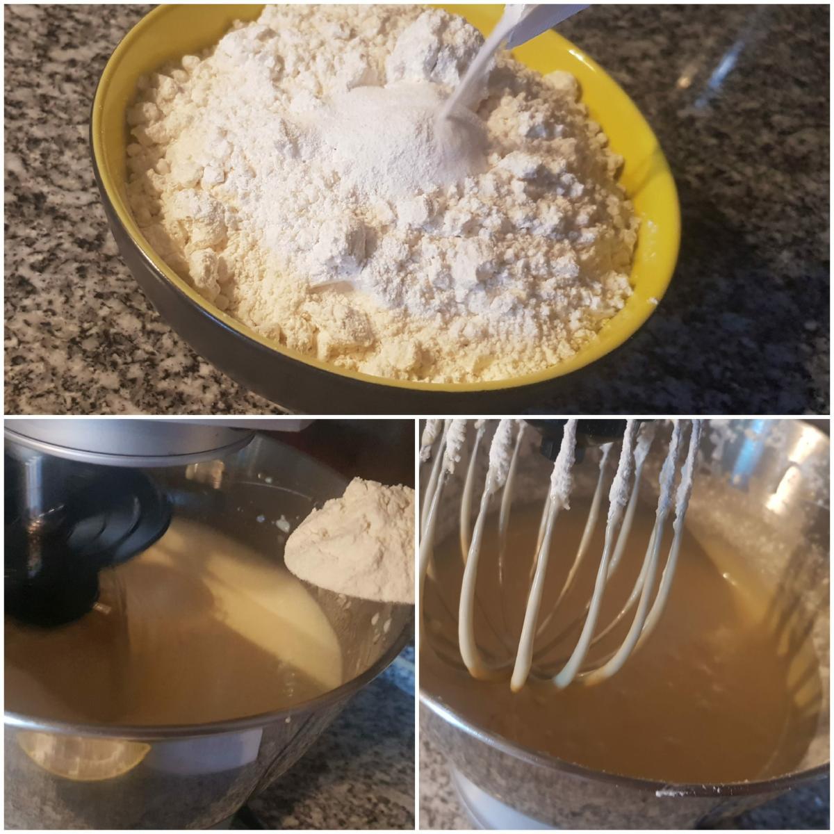 Agregar la harina Pasados los 2 minutos, vamos echando poco a poco la harina, con la batidora al mínimo. A la harina le abremos añadido el sobre de levadura. Yo fui echándolo poco a poco con la ayuda de una cuchara y dejamos un par de minutos que se mezcle la harina bien y que no queden grumos.