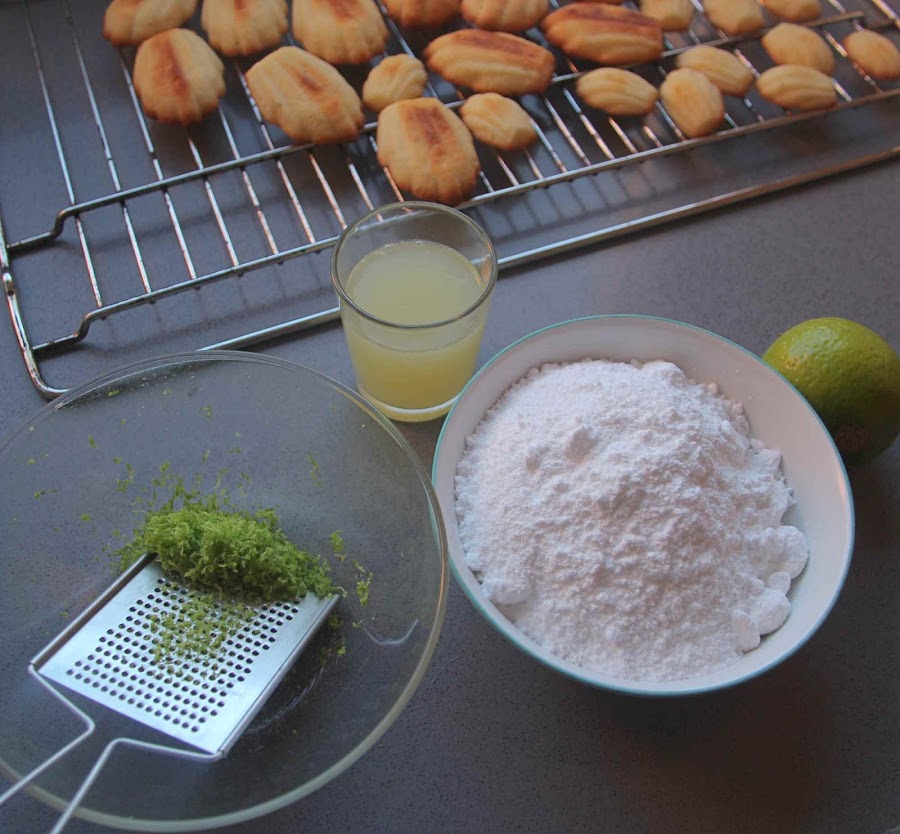 Mientras se enfrían sobre una rejilla, preparamos la glasa, mezclando el zumo de lima y el azúcar glas.
