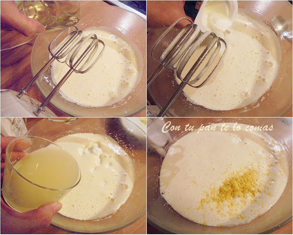 3. Incorpora el aceite, el yogur, el zumo y la ralladura, y sigue batiendo hasta integrar todos los ingredientes.