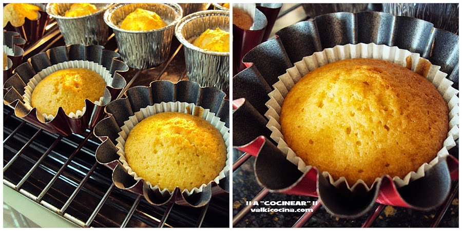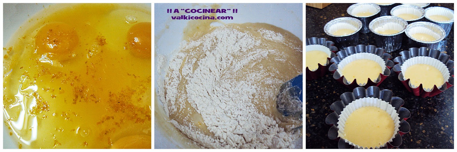 Colocamos moldes de magdalenas dentro de recipientes o flaneras aptos para horno, teniendo en cuenta que no queden demasiado olgados, porque si no se abrirán demasiado y las magdalenas quedarán igual de ricas pero más planas. A mí me ha pasado con los moldes grandes que ves en la foto, pero no tenía más de los otros ...