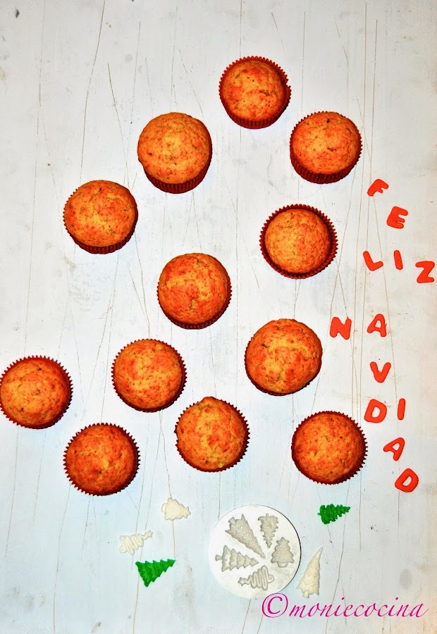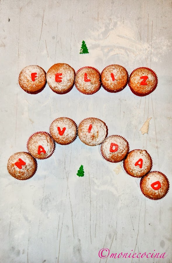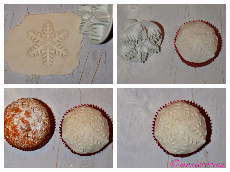 Para los adornos navideños usé fondant rojo para las letras y verde para los abetos. Y para la magdalena con fondant blanco usé un cortador del mismo tamaño para hacer un copo de nieve. Cosas bastante simples pero que dan color y si tienes peques se lo pasan en grande jugando como si fuera plastilina. Claro que a ver cómo les explicas luego que el fondant se come y la plastilina no!! (por experiencia)