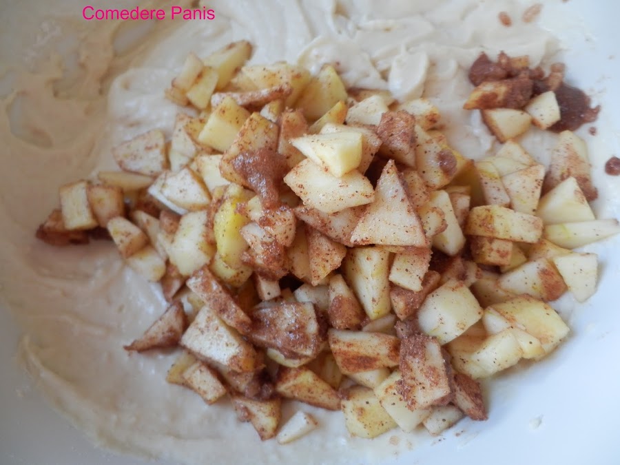 Incorpora las manzanas condimentadas y mezcla la masa.