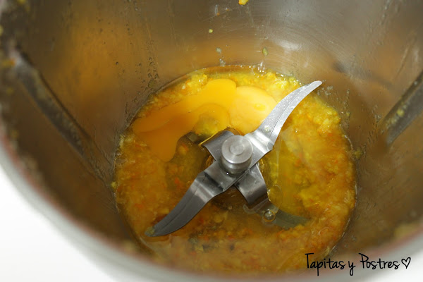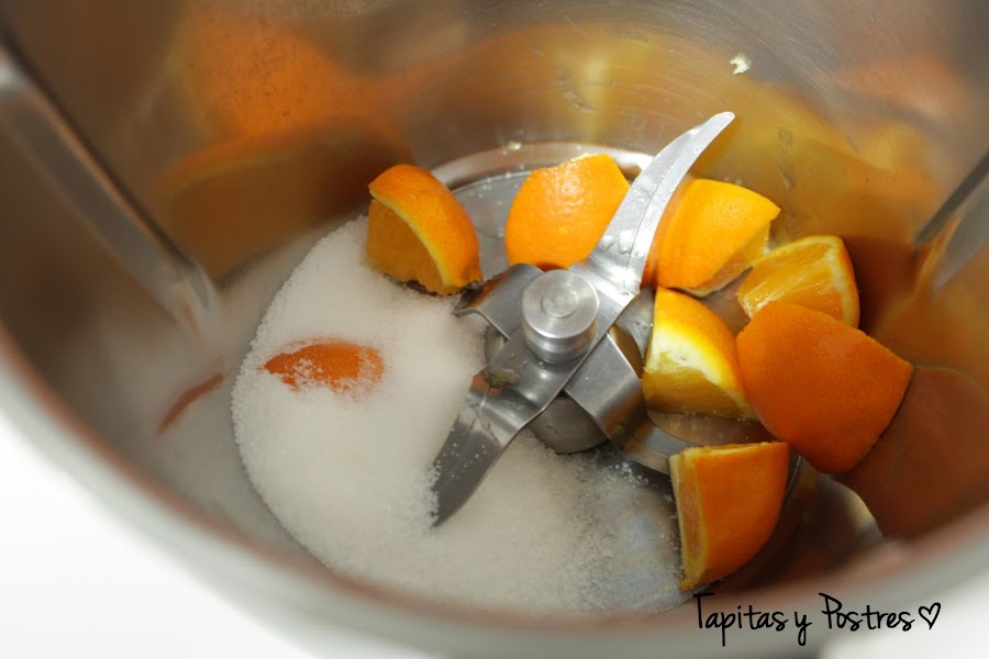 Cortamos la naranja a cuartos y quitamos los huesos que pueda haber. la ponemos junto al azúcar en el vaso de la thermomix (aunque también se puede hacer con una batidora normal). Vamos a triturarlo todo 30 segundos a velocidad 7. Nos va a quedar como un puré.