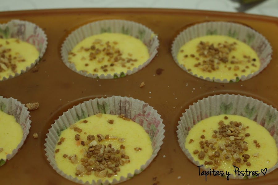Ponemos unas capsulas de magdalena dentro de un molde rígido, puede ser metálico o de silicona. Vertemos mezcla en cada capsula sin llegar hasta arriba. Espolvoreamos azúcar encima y un puñadito de almendras crocantis.