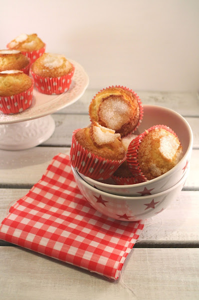 Llenamos las cápsulas que previamente hemos colocado en la bandeja y espolvoreamos con azúcar por encima. Horneamos hasta que las magdalenas estén doradas, aproximadamente unos 20 minutos.