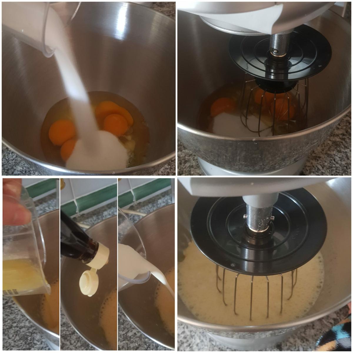 Tiempo necesario: 1 hora y 30 minutos.Batimos los ingredientes Con la ayuda de una batidora eléctrica batimos los huevos con el azúcar hasta que dupliquen su volumen, y le añadimos, la mantequilla derretida, la esencia de vainilla y la nata (crema de leche), y mezclamos bien.