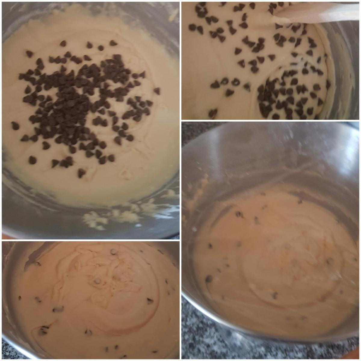 Añadir las chispas de chocolate (opcional) Ahora incorporamos las chispas de chocolate y mezclamos bien. Tapamos el bol con film y lo dejamos en la nevera una hora para que la masa se asiente.