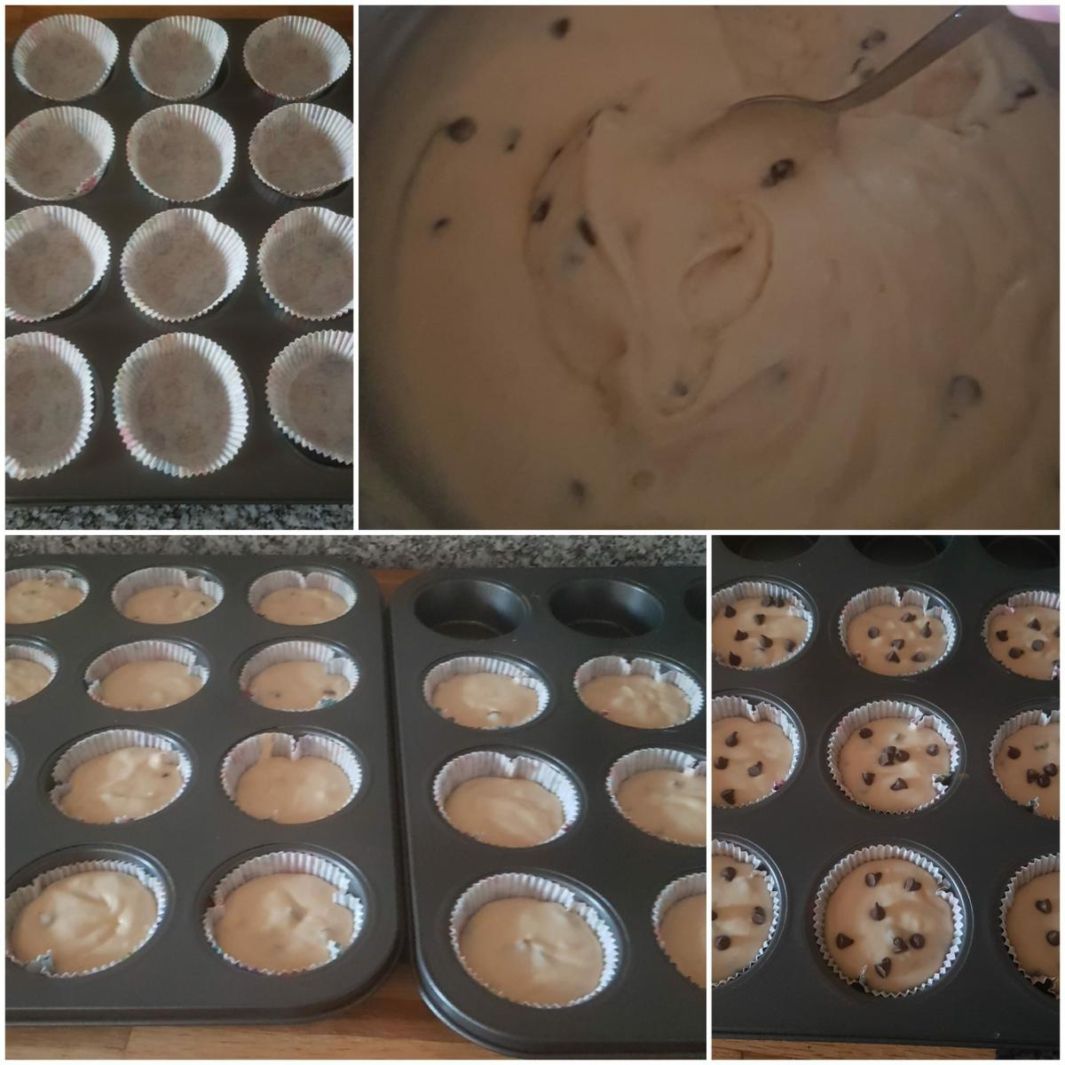 Precalentar el horno Precalentamos el horno a 220ºC con calor arriba y abajo y sin ventilador, y mientras se calienta preparamos los canastillos de las magdalenas y los llenamos con la masa hasta 3/4 partes. Al haber estado la masa en el frigorífico será mucho más fácil rellenar los capacillos. Yo les he puesto unas cuantas chispas de chocolate por encima de decoración.