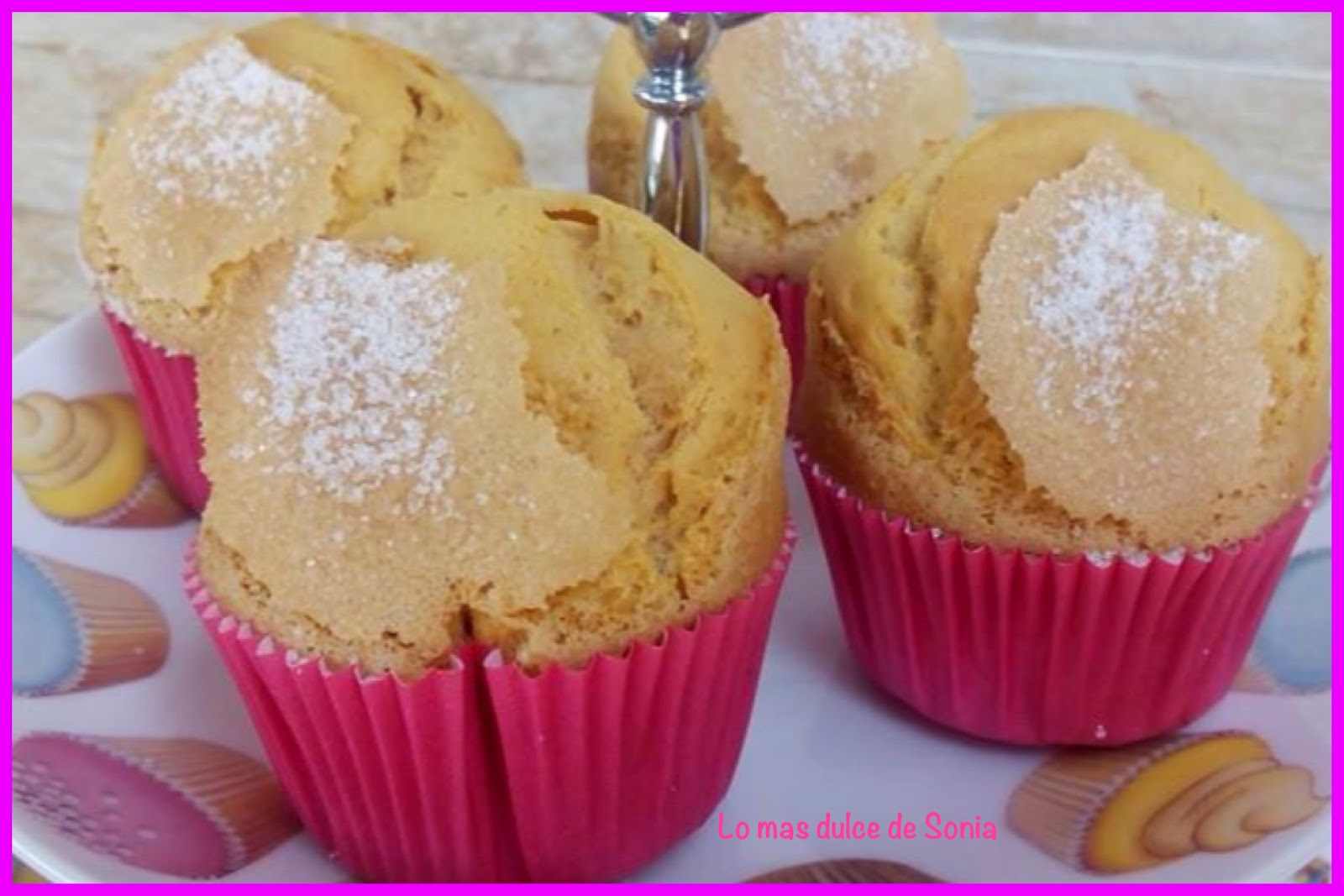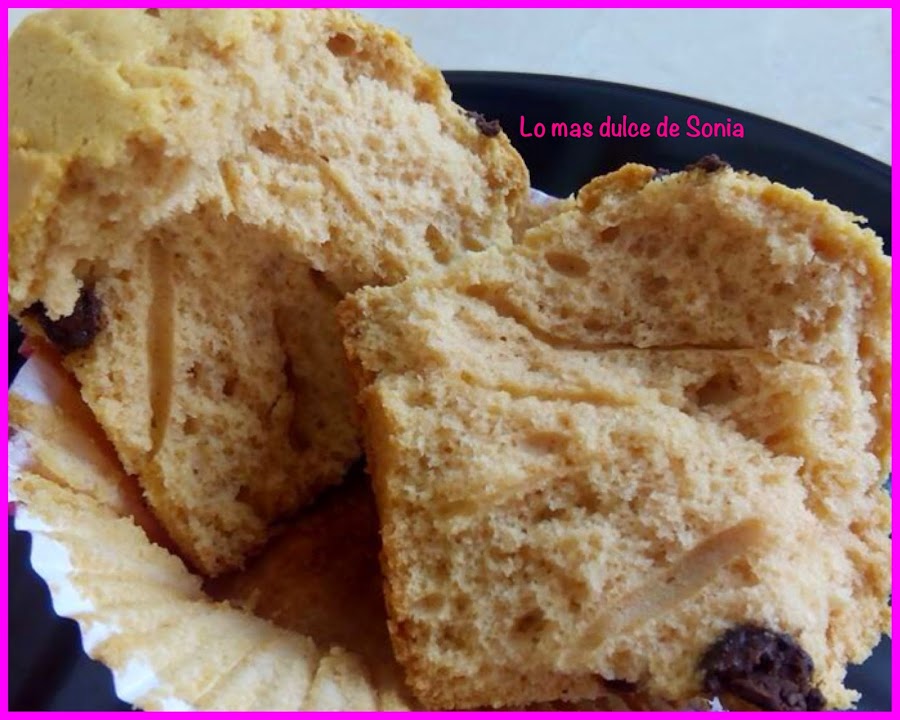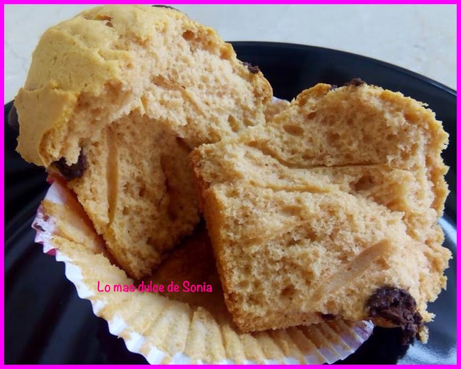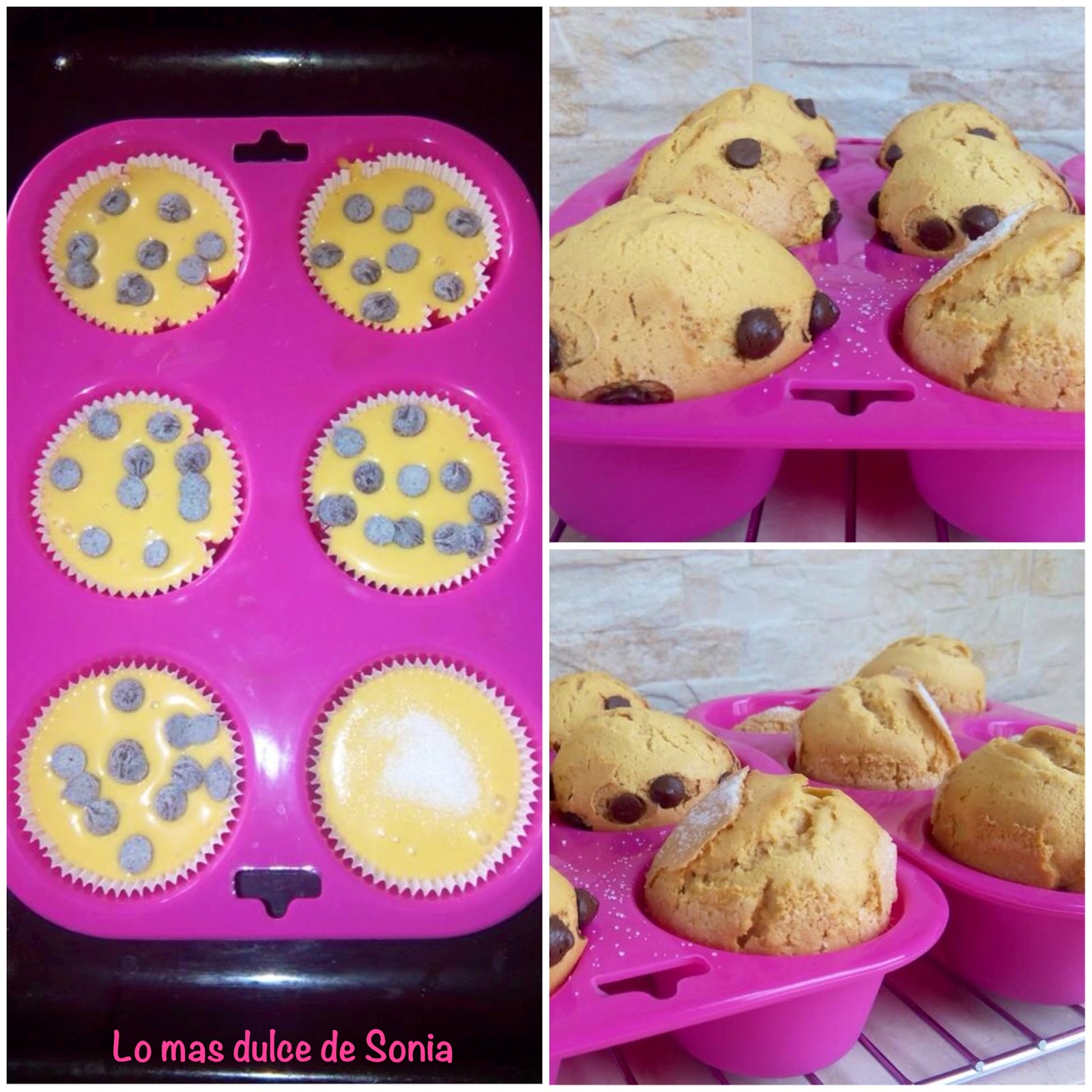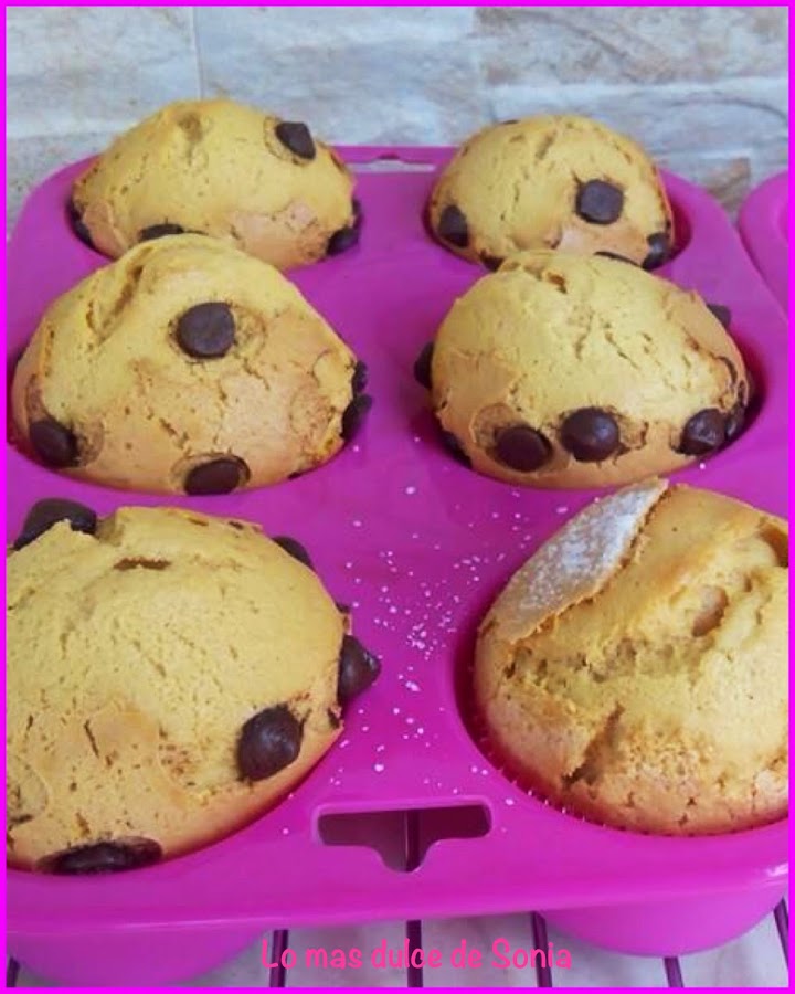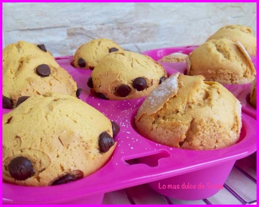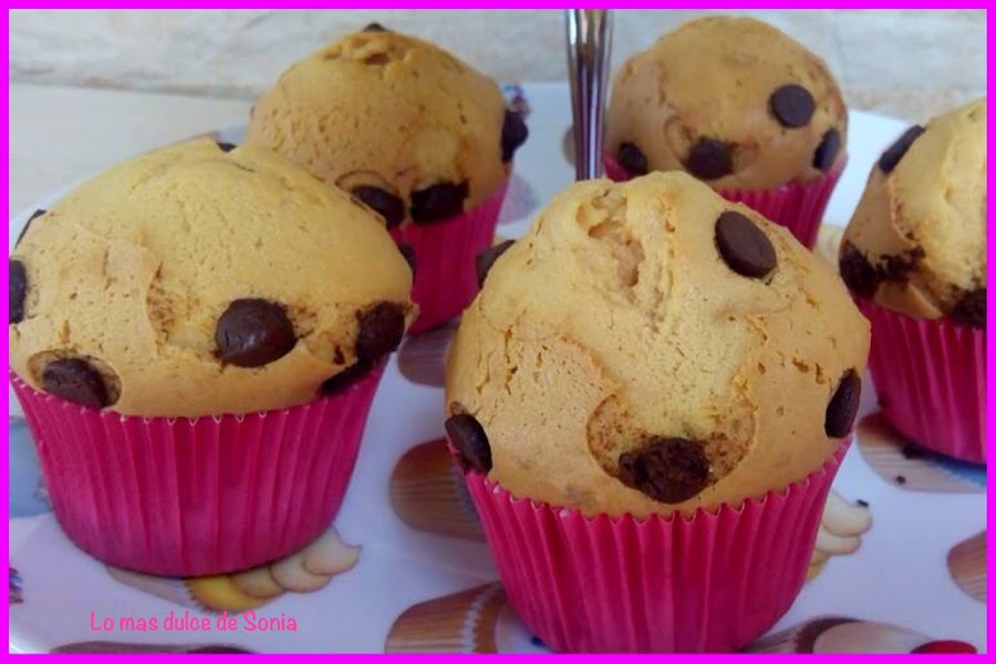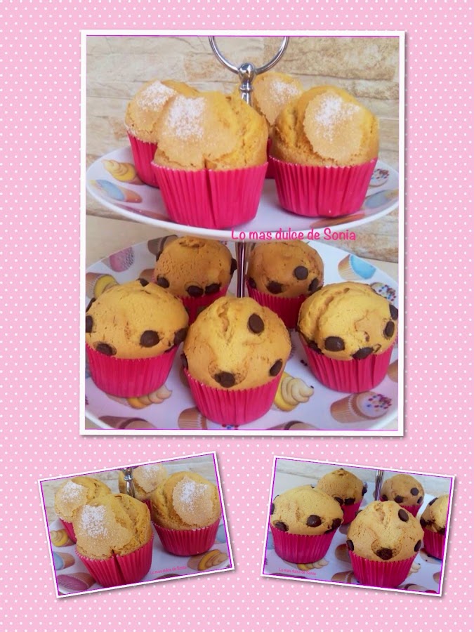 Rellenamos las cápsulas de papel, ponemos un poquito de azúcar o gotitas de chocolate y horneamos a 220, calor arriba y abajo, segunda balda del horno, durante 15 o 20 minutos, dependiendo del horno.