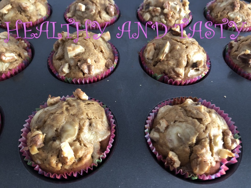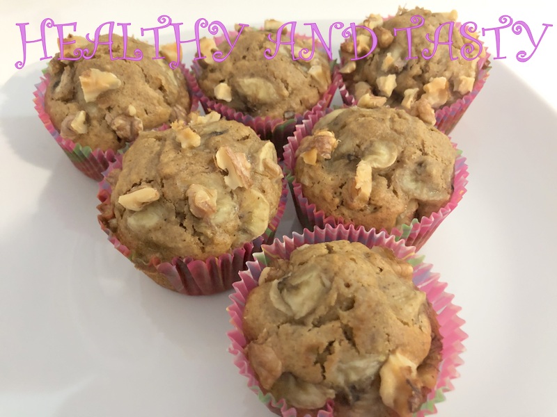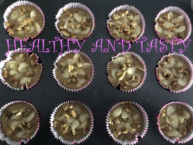 Vertemos la masa en los moldes de magdalenas sin llegar a llenarlos del todo porque luego crecerán. Por último picamos el plátano en trozos pequeñitos y las nueces también. Ponemos varios trocitos de plátano y nueces en cada magdalena. Metemos al horno con calor sólo abajo y horneamos durante 20 minutos. (Vigilad bien el tiempo porque cada horno es distinto).