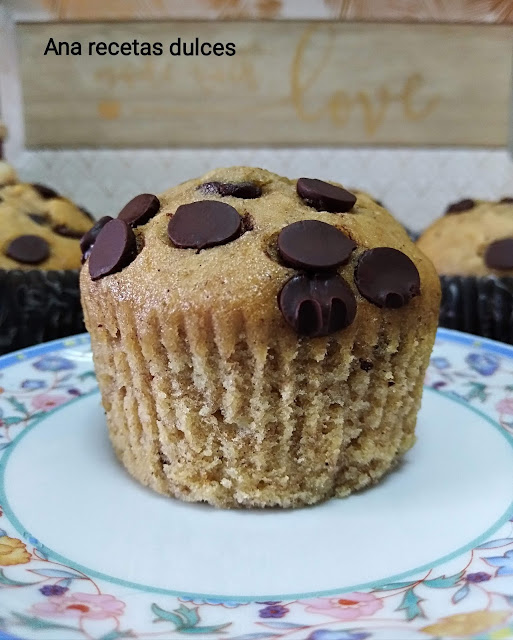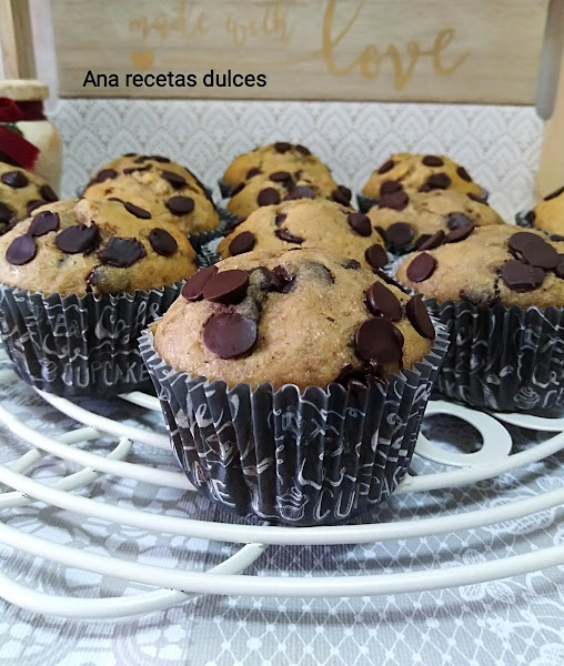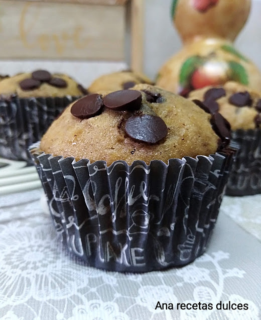 Colocamos las cápsulas en el molde y las rellenamos con la mezcla, repartimos por encima las pepitas de chocolate y metemos en el horno precalentado a 170° grados, de 20 a 22 minutos.