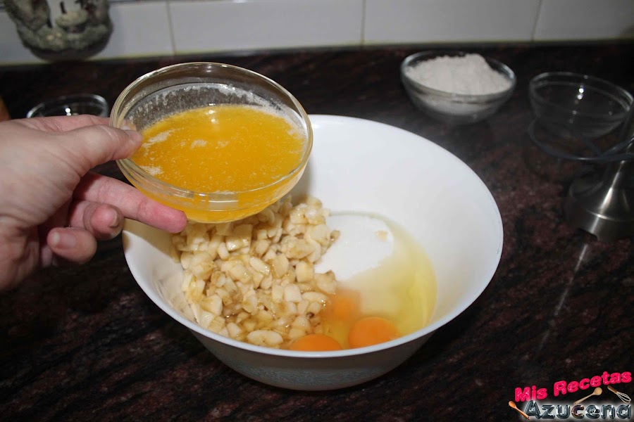 En un bol pondremos los huevos junto con el azúcar, los plátanos que tenemos picados y la mantequilla derretida, ahora con ayuda de una batidora lo batiremos todo hasta formar como una crema.