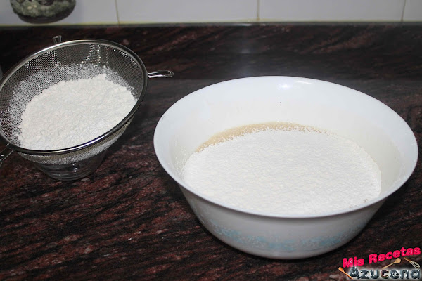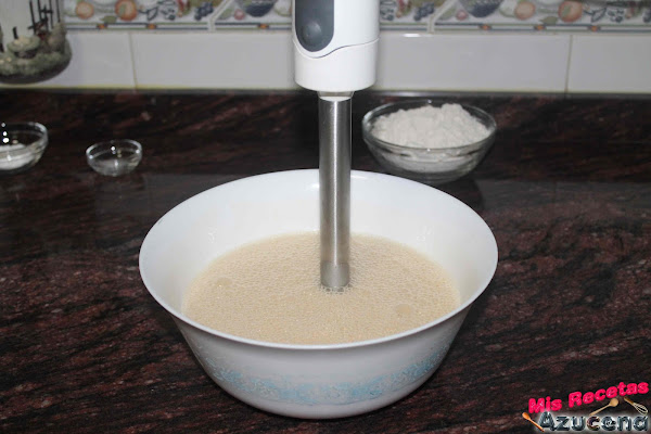 Una vez tengamos todo bien batido sobre este cuenco y con ayuda de un colador tamizaremos la harina, la levadura y la sal, volvemos a mezclar todo bien con ayuda de unas varillas eléctricas o a mano.