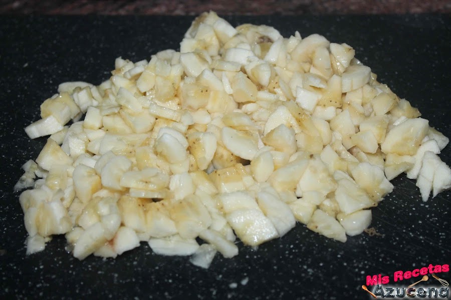 Cogemos 2 de los plátanos los pelamos y los picaremos en trozos (unos 165gr), plátano que nos queda los reservaremos para partirlo en rodajas más adelante.