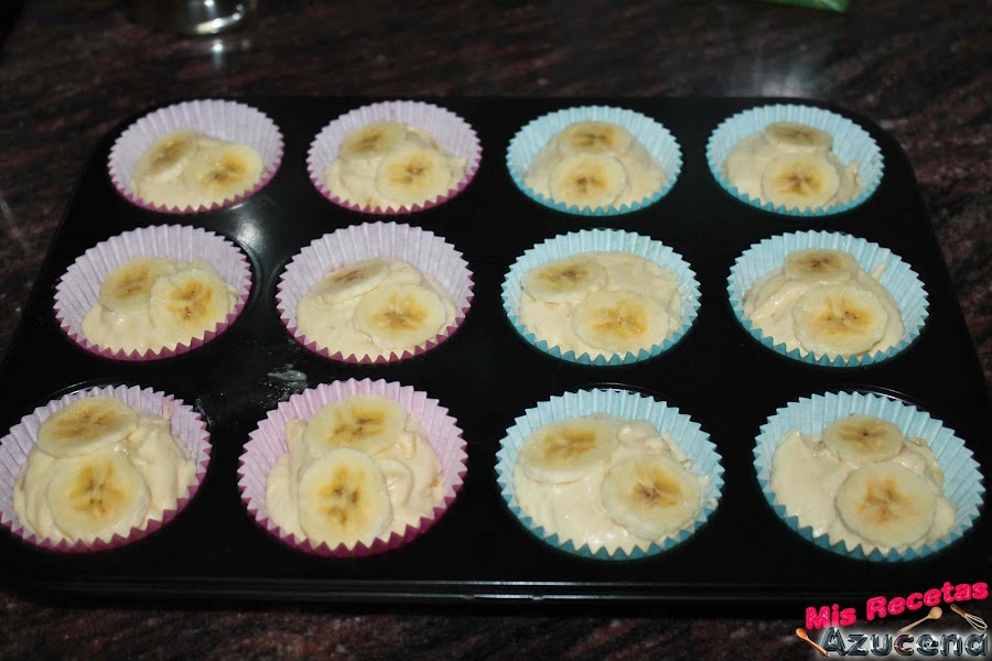 Ahora rellenaremos todas las capsulas unas tres partes, una vez tengamos toda la masa repartida por las capsulas pelaremos el plátano que teníamos reservado y lo cortaremos en rodajas no muy gruesas, colocaremos dos rodajas sobre la masa de cada magdalena.