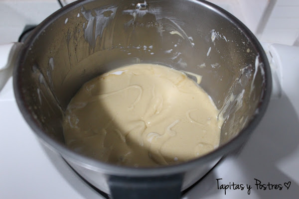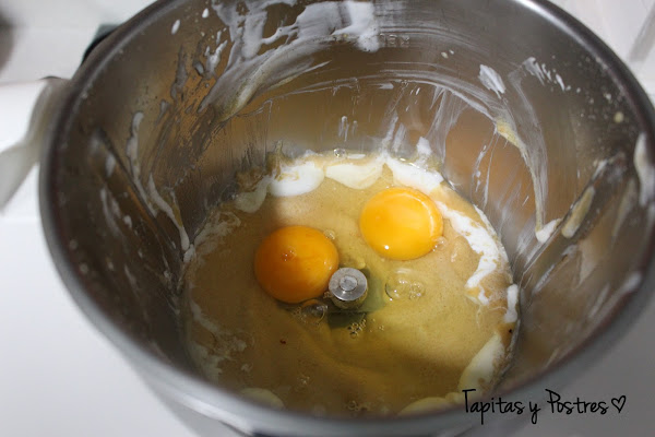 Añadimos la nata (crema de leche), el aceite y los huevos y batimos bien 20 segúndos a velocidad 5.
