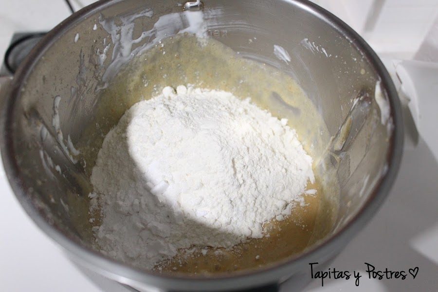Agregamos la harina y la levadura y volvemos a batir otros 20 o 30 segundos a velocidad 5. Vertemos la mezcla en una jarrita o bol y dejamos que repose una media hora.
