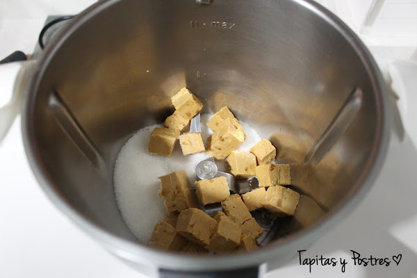 En el vaso de la thermomix trituramos el turrón troceado junto al azúcar.