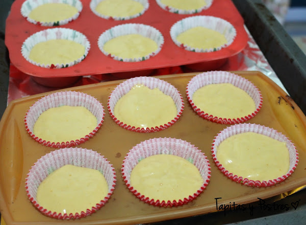 Ponemos las cápsulas de papel dentro de un molde rígido de metal o silicona y vertemos masa de mahdalenas sin llegar hasta el borde. Horneamos unos 20 minitos a 180º con calor arriba y abajo y ventilador.