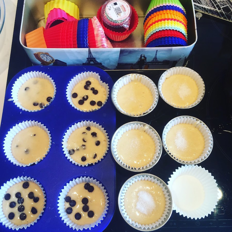 6. Precalentamos el horno a 250º. Sacamos la masa y la colocamos en moldes de papel especiales para magdalenas y para que no se nos deformes a su vez en moldes para muffins. Rellenamos solo 3/4 partes. Espolvoreamos con azúcar o les ponemos pepitas de chocolate.