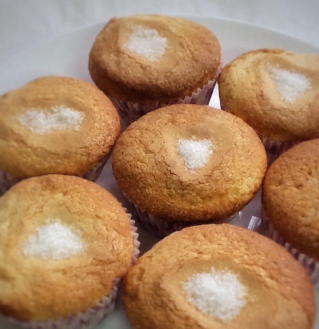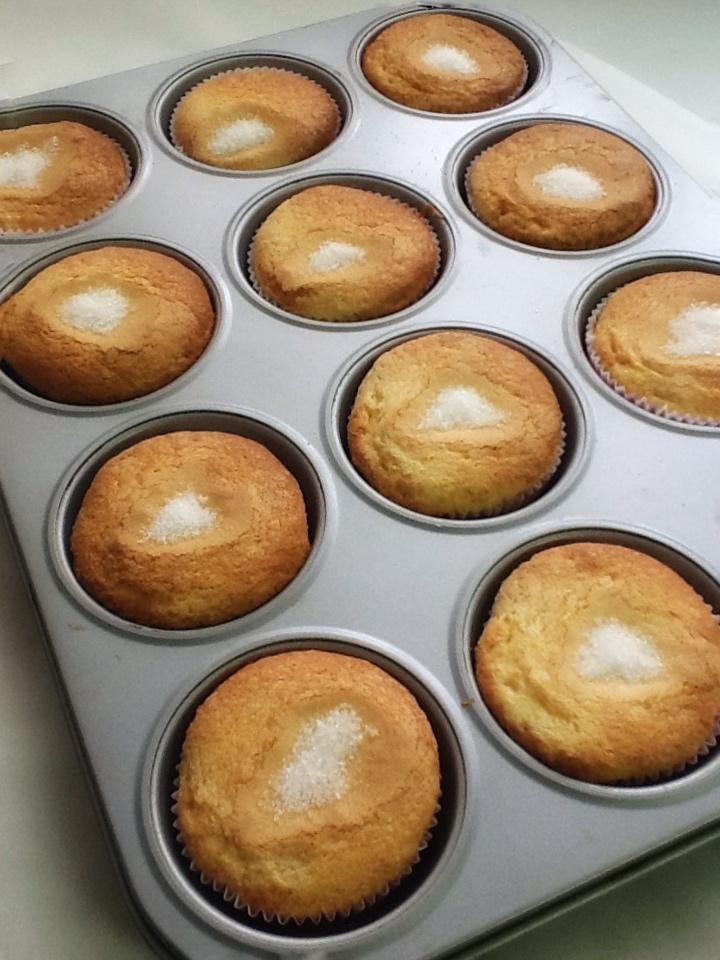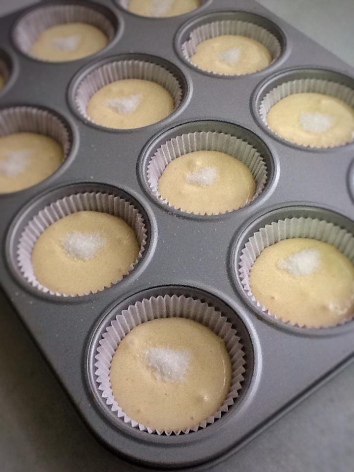 Llenamos cada una hasta la mitad con la masa y espolvoreamos con un poco de azúcar