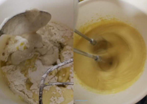 Pondremos la harina, el zumo de limón, la ralladura y el gasificante. Si tenemos masa madre le podremos una cucharada sopera.