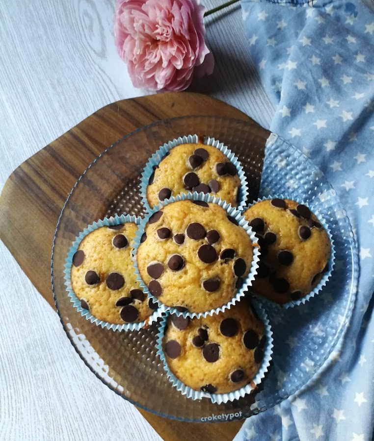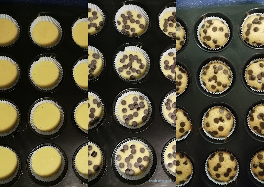 Añadimos por encima las pepitas de chocolate. Y las horneamos a 180º, a media altura con ventilador, durante 15-20 minutos hasta que las veamos doradas.