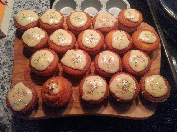 si queréis podéis hacer un glaseado de limón que le pega muy bien, es muy fácil yo use unos 150gr. de mantequilla a temperatura ambiente batida (con tenedor hasta que quede hecha pomada) 200gr. de azúcar glass y el zumo de un limón, mezclamos el zumo con la mantequilla y cuando este bien mezclado vamos incorporando poco a poco el azúcar hasta que se disuelva del todo y lo dejamos enfriar en la nevera para que la mantequilla vuelva a coger cuerpo. Luego solo queda que le pongamos a las magdalenas la cobertura y la decoramos como queramos (yo le he puesto virutas de colores).