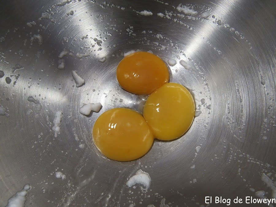 Ponemos las tres yemas en el recipiente donde hemos montado antes las claras. No hace falta lavarlo.