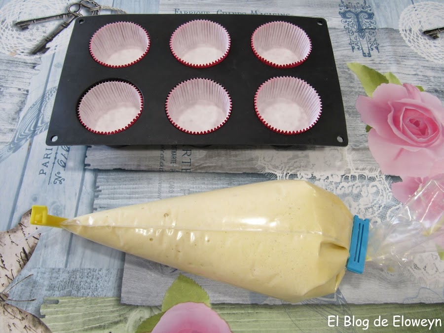 Para que os sea más cómodo verter la masa, os recomiendo ponerla con cuidado dentro de una manga pastelera desechable. Si no tenéis manga pastelera, os puede servir una bolsa de congelación a la que habréis cortado una de las puntas (haced un agujero pequeño). De esta forma, es más fácil rellenar los moldes.