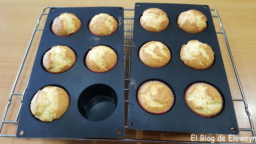 Horneamos durante 15 minutos o hasta que las magdalenas estén hechas (cada horno es un mundo, y a veces el tiempo varía de un horno a otro). Si no sabéis si están hechas, introducid un palillo con cuidado de no abrir mucho el horno y de no quemaros. Si el palillo sale seco, las magdalenas están hechas.