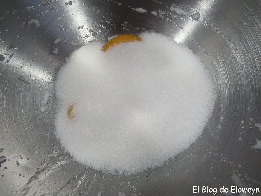 Batimos las yemas con el azúcar hasta que la mezcla tenga un color más claro.